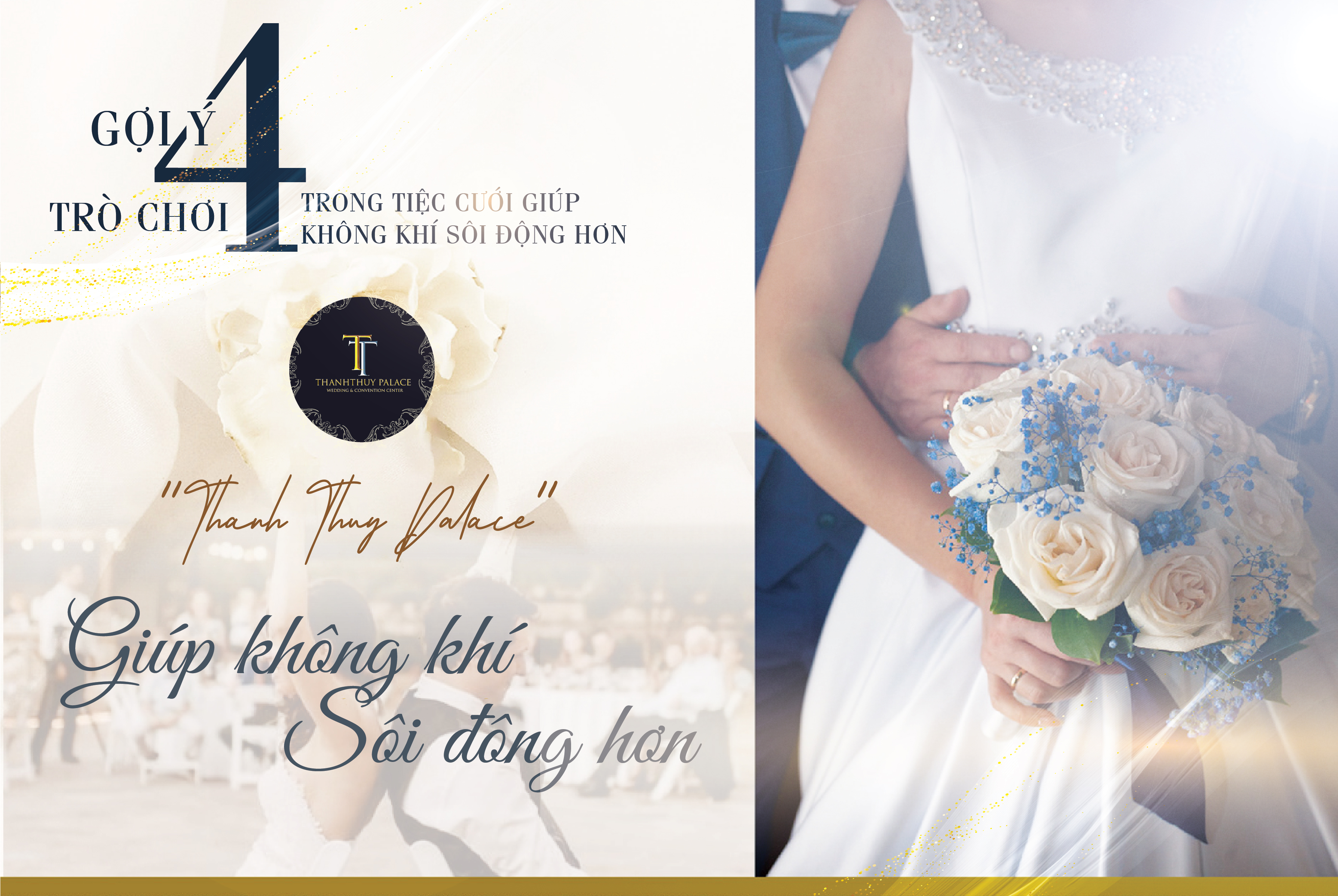 Đám cưới là sự kiện quan trọng trong cuộc đời mỗi người. Bởi vậy, mọi chi tiết trong hôn lễ luôn được cô dâu chú rể chăm chút và mong muốn trọn vẹn nhất. Vậy bạn đã bao giờ nghĩ đến việc tổ chức những hoạt động thú vị giúp đám cưới của mình thêm sôi động chưa? Nếu vẫn còn lăn tăn chưa có kế hoạch nào cho những trò chơi trong tiệc cưới thì tham khảo ngay gợi ý dưới đây của Thanh Thủy Palace nhé!